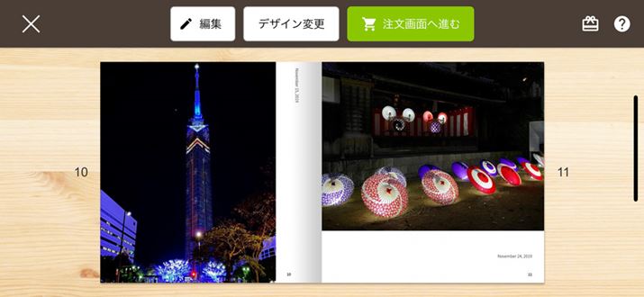 保存したフォトブックをタップすると、印刷プレビューで仕上がりを確認できる。「編集」をタップすれば上の画面に戻り、修正が可能。問題がなければ「注文画面へ進む」をタップし、送付先や支払い方法などを指定して注文する