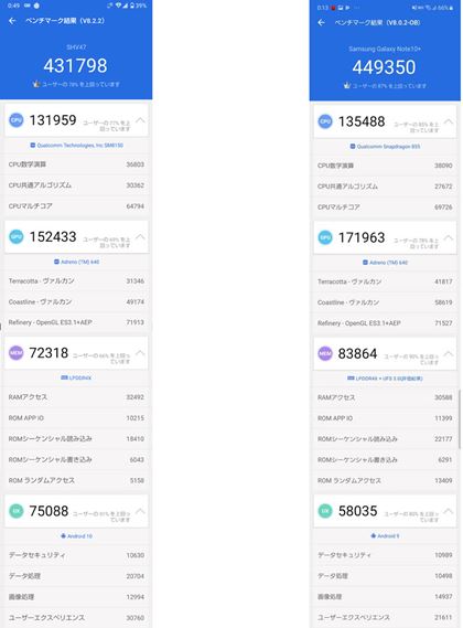 AnTuTuベンチマークのスコア。左が本機、右が現状最速クラスのサムスン「Galaxy Note 10+」のもの。総合スコアでは肉薄している