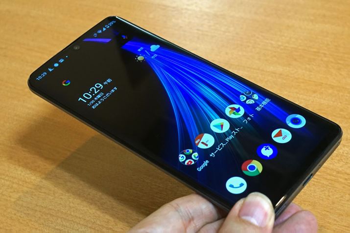 自社開発の約6.4インチ有機ELディスプレイは、2,340×1,080のフルHD+表示に対応し、全面がゆるやかにラウンドした曲面ディスプレイだ。前モデル「AQUOS zero」と比較して最大輝度が約150%向上し、画面のサイズも0.2インチほど広がった。そのいっぽうで4倍速表示に対応させるため、画面解像度がWQHD+からフルHD+へとスペックダウンしている。なお、Dolby VisionやHDR10に対応しているので、ダイナミックレンジの高い映像の再生も得意だ。