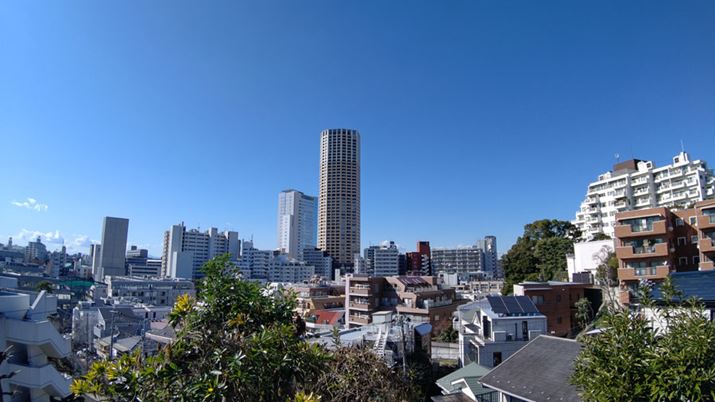 日中の風景を撮影。ややシアンに寄っているが、青空の階調や、周辺部分の解像感は十分だ