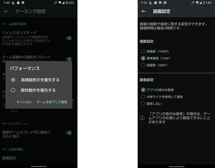 パフォーマンスの調整は2段階のみ(左画面)。録画は480p、720p、1080pの3種類から解像度を選べる(右画面)