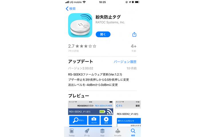 iOSはApp Store、AndroidはGoogle Playストアで「紛失防止タグ」と検索すると、本製品の専用アプリが見つかります(画像はApp Store)