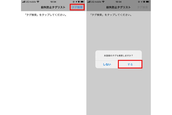 インストールした専用アプリを起動したら「タグ検索」をタップ(左)/初めてタグを登録するので「する」をタップ(右)