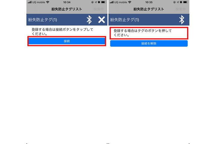 タグが見つかると画面表示が切り替わるので「接続」をタップ(左)/「タグのボタンを押してください」と表示されたら本製品のボタンを短押しします(右)
