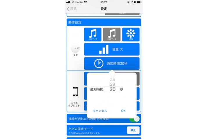 歯車アイコンをタップすると設定画面が開き、音量や通知時間などを変更できます(画像は通知時間を設定している様子)