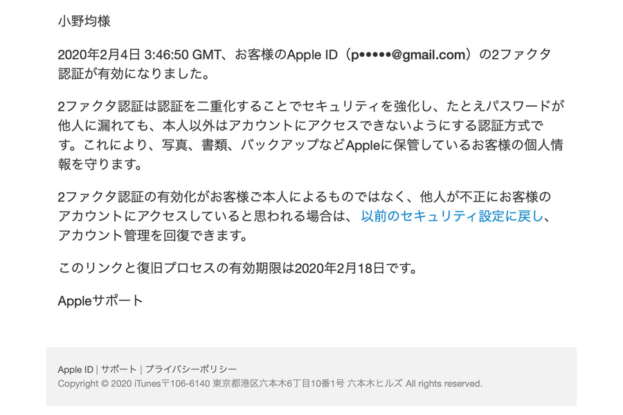 設定完了後、2ファクタ認証が有効になった通知メールが届く。このメールの「以前のセキュリティ設定に戻し」のリンクから無効にできるのだが、表記されている有効期限内でしか無効化できない。期限を過ぎて無効にしたい場合は、Appleサポートへの問い合わせになる