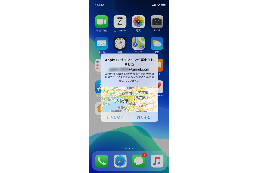 iPhoneに通知が届くので、自分がサインインしていることを確認の上、「許可する」をタップする。なお、実際には福岡からのサインインなのだが、通知では大阪になっている。Apple IDのサインインではときに、こうした位置のずれが見られるので、慎重に作業していただきたい