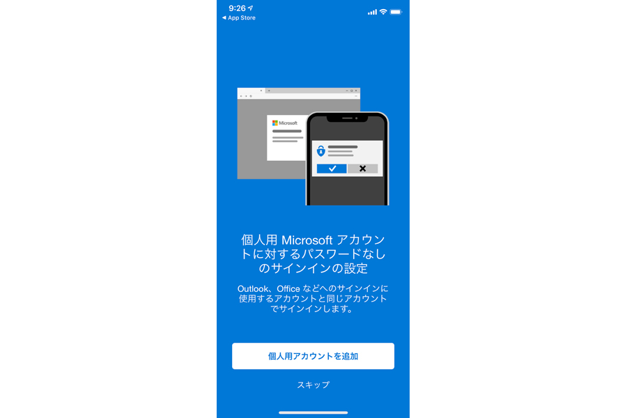アプリをインストールして起動したら、「個人用アカウントを追加」をタップ(画面はiOS版の例)