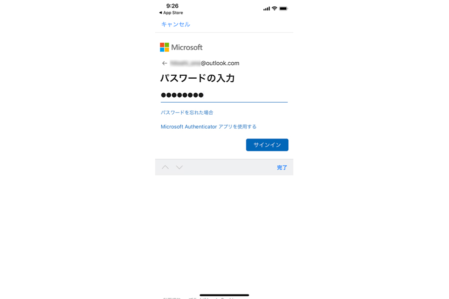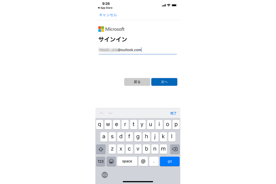 Microsoftアカウントのメールアドレスを入力して「次へ」をタップ