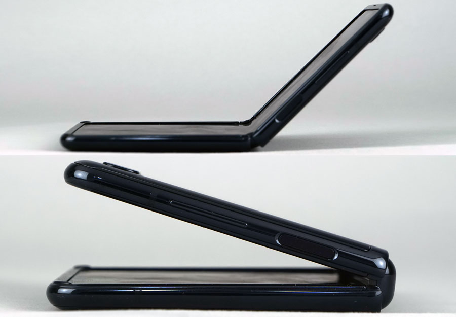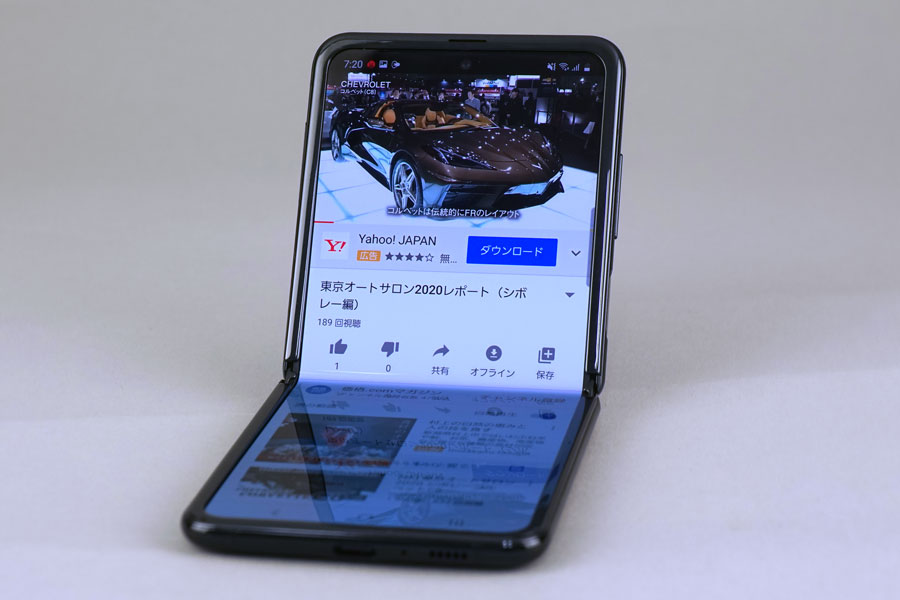 折りたたまれた状態のボディは正方形に近く、スマートフォンらしくない。折りたたみ部のヒンジはかなりしっかりしており、角度を自在に調整したまま保持もできる。そのため、テーブルに置いた状態で縦にも横にも自立可能だ。ディスプレイの表面は折り曲げられる特殊なガラスでおおわれており、樹脂製の保護パネルが使われていたGalaxy Foldよりも、操作時の感触に違和感が少ないうえ、発色や明るさといった画質、応答速度などの面でデメリットも感じにくい。筆者の私用する「Galaxy S9」と比べても、大きな違和感は感じられなかった。スペック値を見ると画面サイズに対して解像度が不足しているようだが、肉眼では顕著な違いは感じることは難しく、VRゴーグルのモニターとして使う場合なら違いがわかるかもしれない、というレベルだ。なお、目立ちにくくなってはいるが、折り目はまだ目立つ。