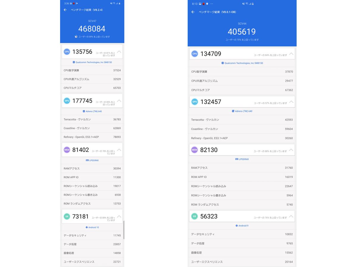 基本性能だが、SoCは「Snapdragon 855+」に8GBのRAMと256GBのストレージを組み合わせる。OSはAndroid 10。このSoCは、「Galaxy S10」や「Galaxy Note10+」、「Galaxy Fold」などに採用されている「Snapdragon 855」の動作クロックを向上させたもので、処理性能とグラフィック性能が15%ほど向上しているという。実際の処理性能を定番のベンチマークアプリ「AnTuTuベンチマーク(バージョン8.2.4)」を使って計測した結果、総合スコアは468,084(内訳CPU:135,756、GPU:177,745、MEM:81,402。UX:73,181)となった。このスコアを、「Galaxy Fold」のスコア405,619(内訳:CPU:134,709、GPU:132,457、UX:56,323、RAM:82,130)と比較すると、確かに15%ほどスコアはよくなっていた。サブスコアを比較すると、GPUのスコア向上が大きく、高い処理性能が要求されるゲームでは威力を発揮するだろう。