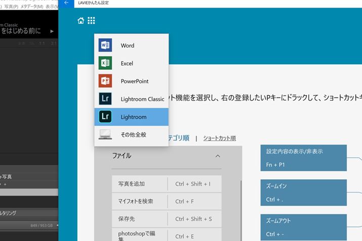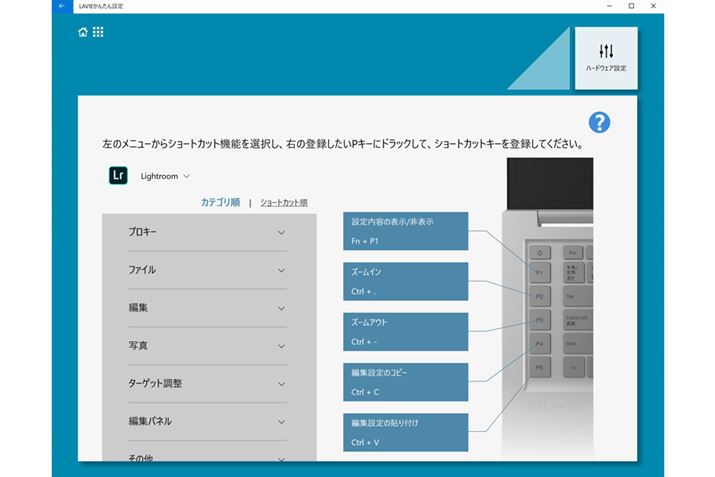 プロキーの割り当ては、「LAVIEかんたん設定」というユーティリティーから行える。プロキーへの割り当ては、ドラッグアンドドロップでできるのが直感的。ショートカットが多すぎて好みの操作を割り当てるのに悩みそうだ