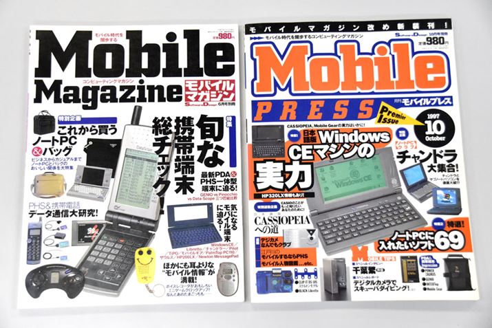 1997年6月に発行された「Mobile Magazine」(左)は、「MobilePRESS」の前身。同年の10月に発行されたのが「MobilePRESS」創刊号(右)