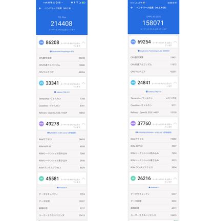 AnTuTuベンチマークの計測結果。左が本機、右がOPPO「A5 2020」のもの。両機はほぼ同価格帯だが、処理性能では約3割という大きな差がついた