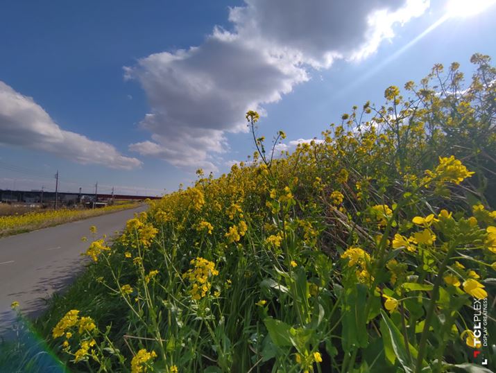 日中の菜の花畑を撮影、逆光だったため、構図左下にゴーストが現われている