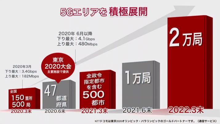 NTTドコモの「5G」サービスは、2020年3月25日より開始される。注目の対応エリアだが、サービス開始当初は、オリンピック関連施設およびスタジアム、全国各地の主要ターミナル駅、商業施設、ドコモショップなど、全国150か所、500基地局というかなり限定されたスポットとして展開されるという。利用する周波数帯だが当初についてはSub-6のみで通信速度は下り最大3.4Gbps、上り最大182Mbpsとなる。その後、2020年6月以降にミリ波サービスが開始予定となっており、通信速度は下り最大4.1Gbps、上り最大480Mbpsとなる見込み。2021年3月末時点で全国の政令指定都市を含む500都市にエリアを広め、2022年3月末に全国2万基地局の稼働を目指す。