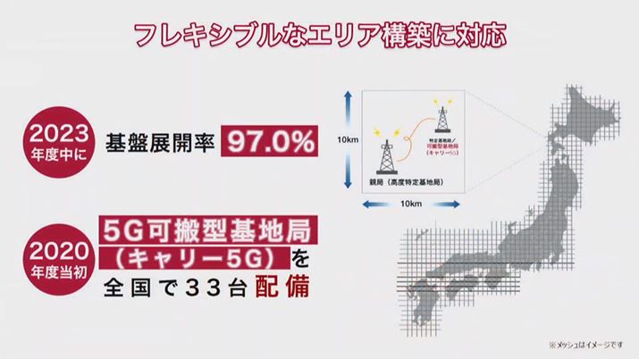 NTTドコモでは全国を10km四方に区切ったエリア内に、その地域の5G基地局の拠点となる特定基地局を作ることを重視している。その特定基地局の展開率では2023年度中に97%を目指す