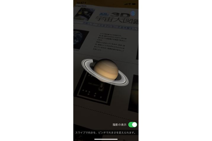 マーカー型の例。「ARで手にとるようにわかる3D宇宙大図鑑」(東京書籍)のサンプルデータで、下記のサンプルPDFを印刷して「AReader」で読み取ると、地球や土星などのCGが表示される