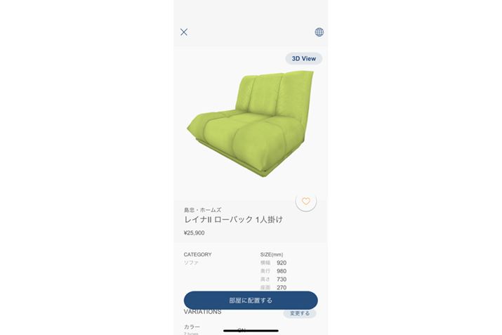 20以上の人気ブランドのインテリア商品を収録し、実際の部屋に仮想的に配置して購入前に確認できる。気になる家具が見つかったら、「部屋に配置する」をタップ