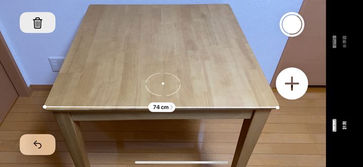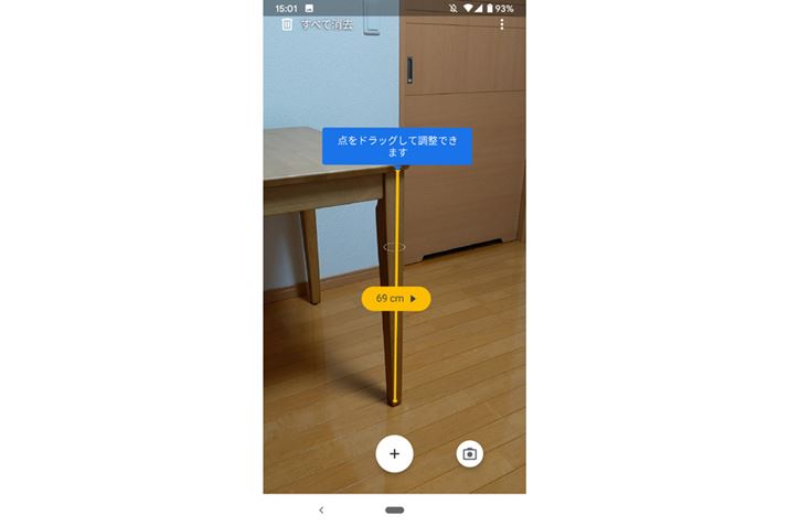 グーグルが提供する計測アプリ。アプリを起動したら画面の指示にしたがってスマホを動かす。空間を認識したら計測したい一方の始点に「●」を移動して「+」をタップ。終点に「●」を移動して「+」をタップするとおおよその距離が表示される