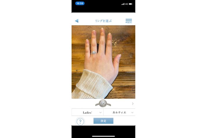 高島屋が販売するブライダル&アニバーサリーリングの試着ができる。女性、男性ともに対応で、はじめに左手を撮影し、リングを選んで試着する。アプリから購入はできないが、写真を保存したり、メールで送信ができる