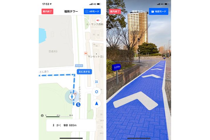 Googleマップの徒歩によるルート案内では、ARによる道案内(ライブビュー)を利用できる。目的地を指定してナビを開始し、画面左下に表示される「ライブビュー」ボタンをタップすると、実際の風景に重ねて曲がる方向などの情報が表示される