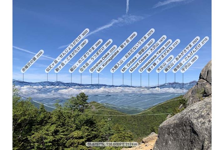 現在地から見える山の名前がわかる山座同定アプリ。アプリを起動して画面左上のカメラアイコンをタップ。ファインダーをのぞくと山の稜線が線画で表示されるので、実際の風景に重ねると山の名前がわかる