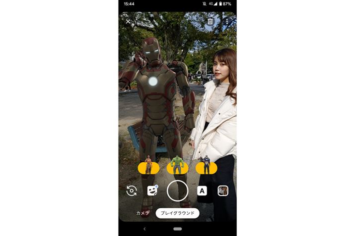 Pixelの「カメラ」機能として提供されるAR機能。「その他」から「プレイグラウンド」を選択。シャッターボタン左横のボタンをタップすると、ピカチュウやマーベル・スタジオの「アベンジャーズ」の登場キャラクターなどが選べる。ARだけでなく、顔認識やAIも活用するため、人の動きに反応したり、表情を変えたりもする(「Pixel 3」で確認)