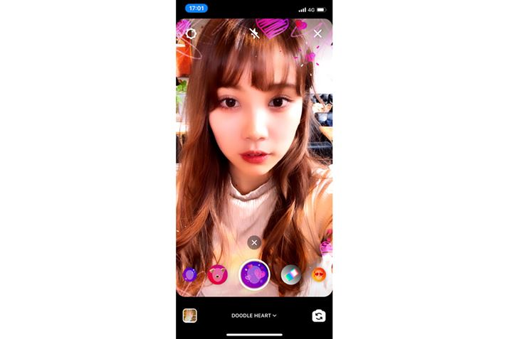 Instagramのストーリーズ機能にも、SNOWと同じような機能がある。ストーリーズ機能は、24時間限定で静止画や動画をシェアできる機能のこと。ストーリーズの撮影画面を呼び出すと、画面下部のさまざまなエフェクトが楽しめる