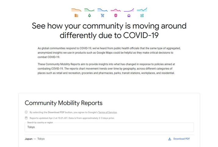 Googleは、スマートフォンの位置情報を利用して、飲食店や駅、公園、自宅などの人の人数の変化を可視かした特別サイトを公開しました。新型コロナウイルスの感染拡大予防のため、各国で外出制限などの対策が取られる中、人がどのような行動を取っているのか、自宅にいるのか、それとも外出しているのかなどのデータが各国ごとに閲覧できるようになっています。