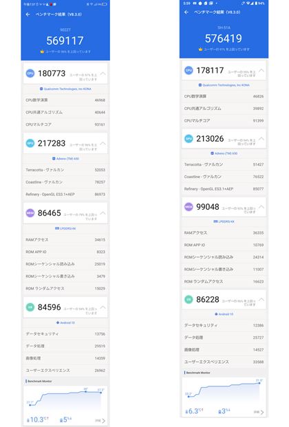 AnTuTuベンチマークの計測結果。左が本機、右が「AQUOS R5G」のもの。同じSoCを使っているためスコアの傾向はよく似ている