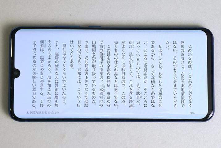 白の背景で電子書籍を表示させた。活字ににじみは感じられず背景もきちんと白く見えており、有機ELディスプレイで起こりやすい色かぶりも見られない