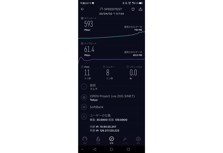 実際の5G通信速度を、東京・銀座にある「ソフトバンク銀座」付近で計測したところ、下りで594Mbps、上り61.4Mbps、Pingは11msを記録した。アンテナの近くなら200〜500Mbpsの通信速度は出るようだ。そのいっぽうで、アンテナが目視できないほど離れた場所になると、途端に10〜30Mbps程度まで通信速度が低下した。