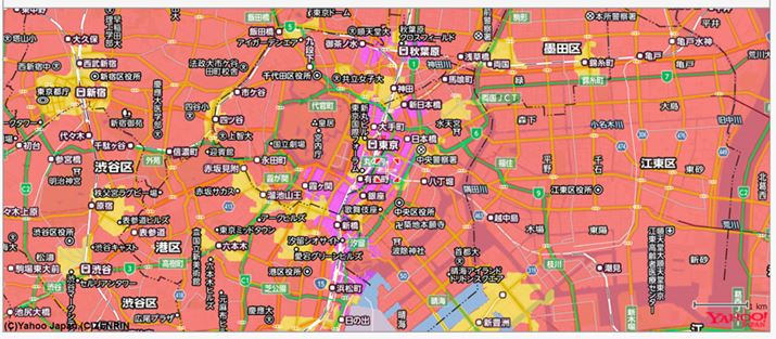 ソフトバンク5Gの、首都圏におけるエリア地図。ピンクが4月末までに5Gエリア化する予定の部分、黄色は今夏以降にエリア化する予定の部分だ