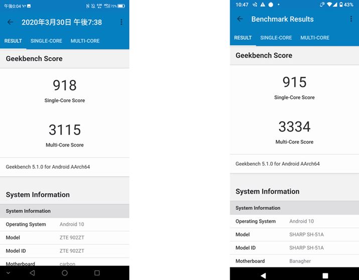 こちらは「GeekBench 5」の計測結果。左が本機、右が「AQUOS R5G」のもの。シングルコアのスコアは本機が918で、AQUOS R5Gが915でほぼ同じ。マルチコアでは、メモリーの容量が多いためか、AQUOS R5Gのほうが200ポイントほど高い結果となった