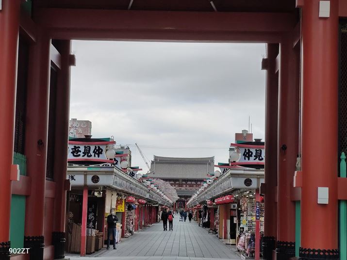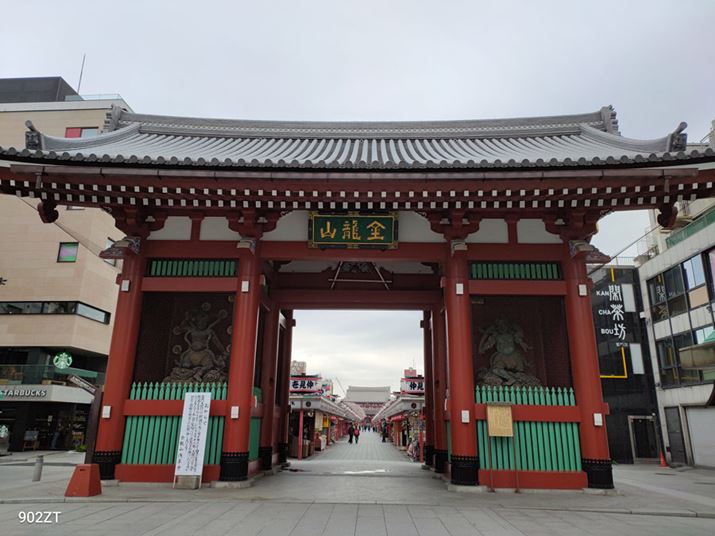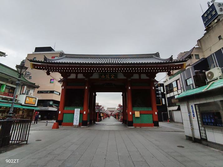 浅草寺の雷門を撮影。12mmという超広角のため、門の周辺もしっかり構図に収まっている。明暗差が比較的大きい構図となったが、屋根の陰部分にはノイズが現われている