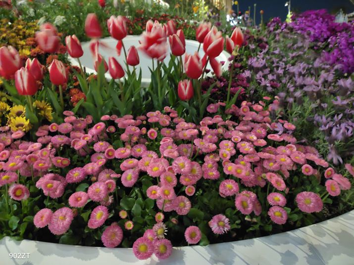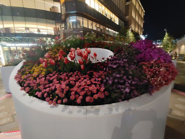 夜の花壇を撮影。風の強い日だったので被写体ブレが現われた。中央部分は良好な画質だが構図の周辺になると荒れが目立つ