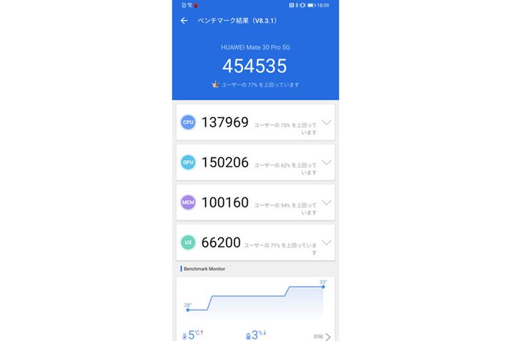 ベンチマーク測定アプリ「Antutu Benchmark」の総合スコアは454535。特にMEMのスコアが高くなっている。アプリの起動や切り替え、カメラの画像処理時間などは素早く、ハイエンド端末として十分スムーズな動作でした