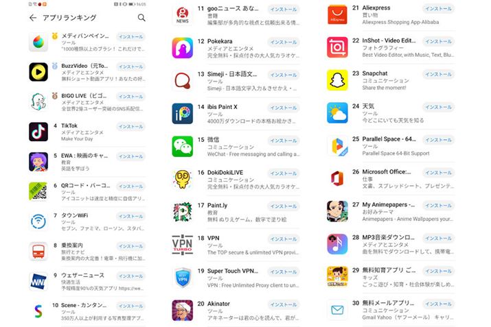 「Huawei AppGallery」のアプリ人気ランキング30位までを見ると、Google Play(日本)のランキングでは見られないアプリのラインアップ