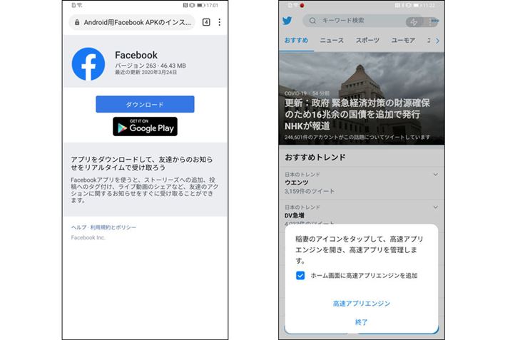 「Huawei AppGallery」では、Facebookは公式サイトから直接ダウンロードできるURLを記載。Twitterについては、ブラウザー版をベースとする「高速アプリ」として利用可能。今は未登録のアプリも、今後こういった形で使えるようになれば弱点を補えるかもしれません