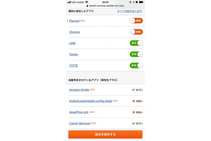 「あんしんフィルター for UQ mobile」におけるアプリのフィルタリング設定画面。アプリの利用可否は年齢別に一括設定されるほかに、保護者が個別に設定することも可能です
