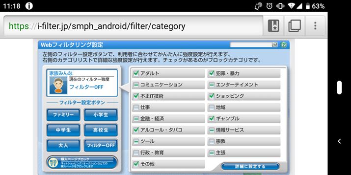 「i-フィルター」は大手キャリアの「あんしんフィルター」のような多機能なフィルタリングサービスで、利用できる機能は子どもが持つスマートフォンの機種によって異なります。専用アプリに組み込まれたブラウザーによるWebサイトのアクセス制限や閲覧時間制限はAndroidとiPhoneのどちらでも利用できますが、Androidでは使えるアプリの制限、アプリを利用できる時間の制限、子どものスマートフォンの位置情報確認といった機能を利用することも可能です。