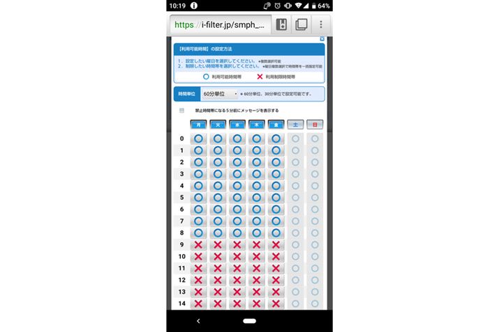 「i-フィルター」の利用可能時間設定画面。曜日ごとに利用できる時間帯を最短30分単位で指定することができます