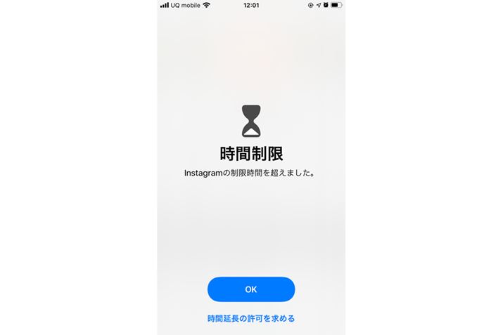 「スクリーンタイム」でアプリの利用が制限された様子。スクリーンタイムでは利用時間の延長も可能ですが、専用のパスコードを設定しておけば保護者が延長の可否をコントロールできます