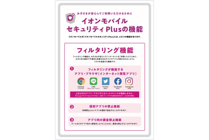 イオンモバイルでは独自のフィルタリングサービス「イオンモバイルセキュリティPlus」(月額200円)を提供しています。対応する子どものスマートフォンはAndroidで、Webサイトとアプリの利用制限、子どものスマートフォンの位置情報確認、紛失時のリモートロック機能などが利用できます。