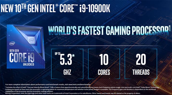 「Core i9 10900K」と「Core i9 10900KF」は、ターボ・ブースト時の最大クロック5.3GHzを達成。同社は“世界最速のゲーミングCPU”とアピールしている