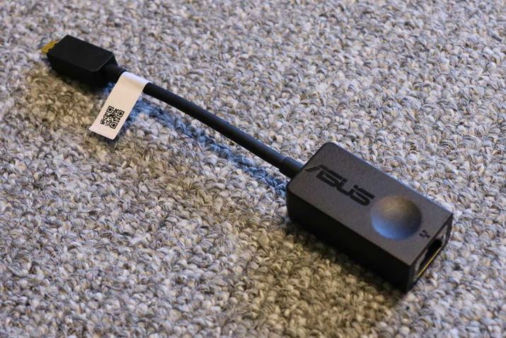 microHDMIポートを使って有線LAN接続するためのアダプターが付属。USBアダプターを使うとMacアドレスが変わるのを防げる