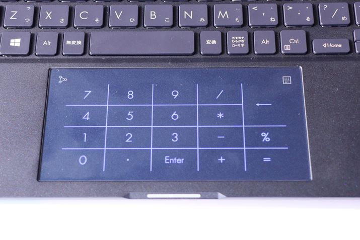 タッチパッドはテンキーとして利用できるNumberPad 2.0。右上をタッチするとテンキーが出現し、左上を1秒押すと明るさを2段階で調節できる