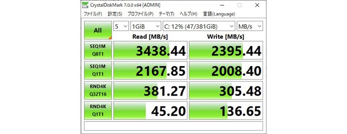 ストレージの読み書き速度を測定するベンチマークソフト「CrystalDiskMark 7.0.0 x64」の結果。PCIe 3.0 x4 SSDを搭載しており、読み込み3438.44MB/s、書き込み2395.44MB/sの高速な読み書きを記録