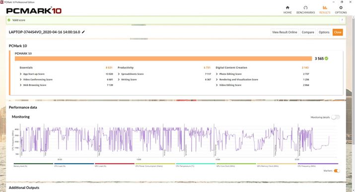 パソコンの総合的なパフォーマンスを測定する便利マークソフト「PCMark 10」の結果。今回はCore i7-10510Uを搭載した上位モデル(33Whr)を試したが、トータルスコア3565と高いスコアを記録した